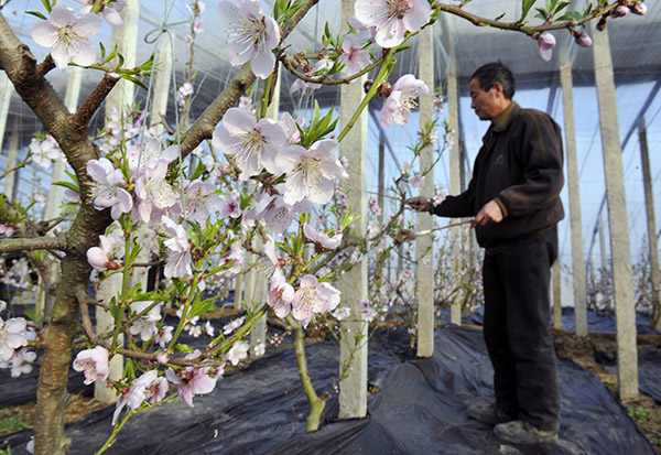 隆冬时节,在河北省泊头市营子镇刘辛庄村的百亩油桃种植基地,温室大棚内的桃花竞相绽放。这里的桃园按照“农民自愿、合理流转”的形式由专业合作社进行承包栽植,4月份油桃即可上市,预计每亩收入达5万元左右。