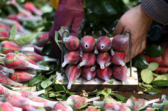 2月12日,一名花农在云南呈贡斗南花卉市场内包装红玫瑰。