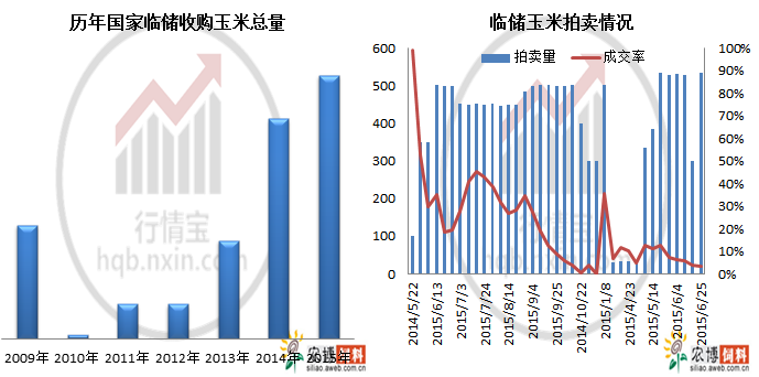 2014/15年度玉米临储收购总量8279万吨,较上一年度减少1360万吨,降幅19.66%,达历史高点。按理来说,收购天量玉米之后,基层玉米粮源见底,价格应出现去年的大幅上涨行情,不过今年仅3月价格短暂性大幅走高。政策性拍卖也提前启动,问了稳定市场价格。不过,从投放量及成交量情况来看,本年度可用惨淡形容。自4月9日临储玉米起拍至6月19日,今年临储拍卖共进行11论,计划拍卖3507.1万吨,实际成交296.2万吨,成交比例