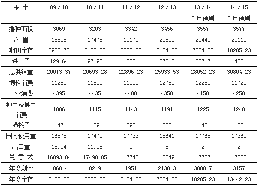 据业内机构5月预测数据显示,2014/15年度全国玉米产量为20119万吨,较上一年度略有减少。消费方面,2014/15年度全国玉米饲料消费为11720万吨,工业消费为4250万吨,食用等消费1240万吨;同上月预测值相比,玉米饲用消费再度减少,主要取决于国内养殖业恢复周期的长短。整体来看,2014/15年度全国玉米处于供应宽松状态。