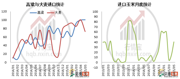 进口高粱、大麦等替代品对于国内玉米市场来说存在很大的性价比,同时不存在进口配额的限制,备受下游企业追捧。农博饲料小编听说,目前部分饲料企业效仿欧美国家饲料配方,完全替代玉米的使用量。是否存在可行性我们暂且不论,玉米的饲用添加比例大幅下滑这倒是事实,饲料企业对国产玉米的依赖度下降。因此,大量的进口高粱及大麦是直接打压国内玉米价格的一个主要原因。数据统计:2015年1-5月我国进口高粱426.86万吨,同比去年增长282.23万吨,涨幅高达195.14%;进口饲用大麦438.90万吨,同比去年增长228.59万吨,涨幅108.69%。