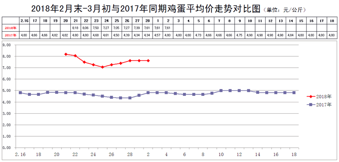 3月2日,新发地市场鸡蛋的批发价是3.81元/斤,比2月23日的3.75元/斤上涨1.60%;比2018年2月2日的4.33元/斤下降12.01%;比2017年3月2日的2.40元/斤上涨58.75%。周环比小幅上涨;月环比大幅下降;年同比大幅上涨。上周末,年同比上涨60.26%,本周同比涨幅略有缩小。