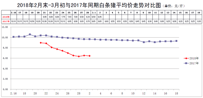 2018年3月2日,新发地市场白条猪的批发平均价是6.45元/斤,比2018年2月23日的8.08元/斤下降20.17%;比2018年2月2日的8.45元/斤下降23.67%;比2017年3月2日的9.65元/斤下降33.16%。周环比大幅下降;月环比大幅下降;年同比大幅下降。上周末,年同比下降20.39%,本周同比降幅继续放大。