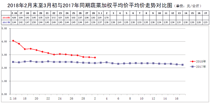 本周内的最高价3.05元/公斤(2月24日),比上周的3.84元/公斤下降20.57%;本周内的最低价2.79元/公斤(3月2日),比上周的3.01元/公斤下降7.31%。本周的最高价出现在周前期,最高价出现在周后期,说明本周菜价是在连续下行的。