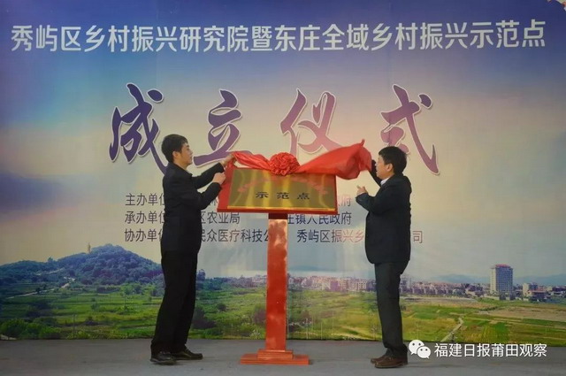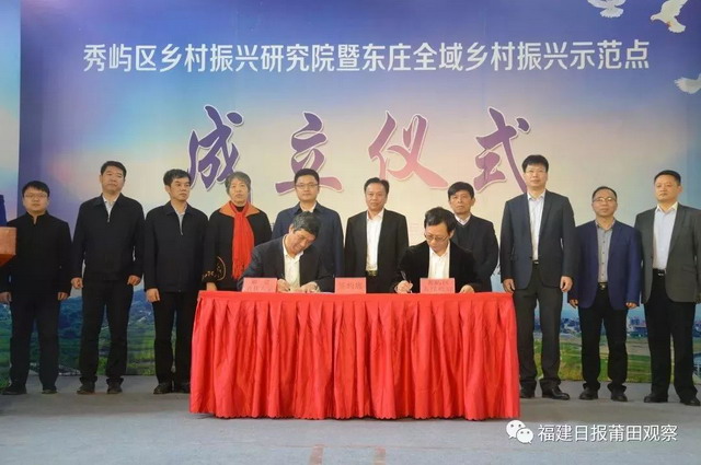 12月23日,由福建农林大学与秀屿区联合成立的莆田市首家乡村振兴研究院暨东庄全域乡村振兴示范点成立仪式在秀屿举行。市政府副市长吴健明,秀屿区领导郑加清、蔡晃、姚冰珊等以及福建农林大学郑宝东副校长、林文雄教授、张春霞教授等出席仪式。