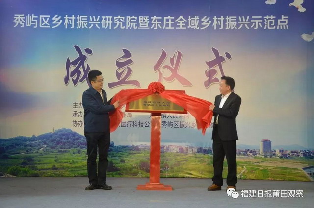 莆田市政府副市长吴健明、福建农林大学副校长郑宝东教授为秀屿区乡村振兴研究院揭牌