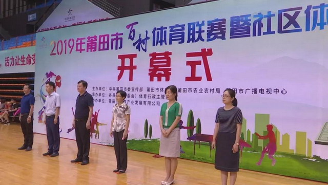 为隆重庆祝中华人民共和国成立70周年,全面落实我市“十三五“全民健身实施计划,推动全民健身运动广泛开展,由中共莆田市委宣传部、市体育局、市农业农村局及市广播电视中心联合主办的“2019年莆田市百村体育联赛暨社区体育节”,今天上午在市体育中心举行了盛大的开幕仪式。莆田市体育局局长陈凤珠,莆田市广播电视中心主任柯国新等领导,百村体育比赛项目各代表队运动员们、裁判员以及媒体记者、主承办单位有关人员、社会群众等共同参加了此次开幕仪式。
