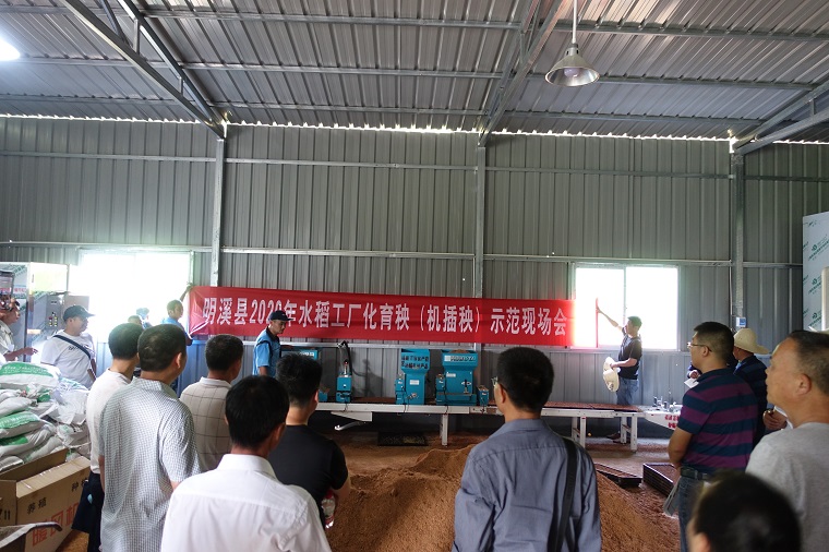 在水稻育秧流水线设备旁,与会人员观摩机具从软盘装土、播种、洒水、盖土等作业流程,听取操作员讲解流水线上的关键技术环节和注意事项。在田间,工作人员现场演示机插秧的全过程。工厂化育秧方式自动化水平高,操作轻便,每小时可育400-500盘,既省工又省时,育出的秧苗整齐、规范,适宜机插。推广水稻全程机械化可以全面提高水稻秧苗品质和育秧效率,有利于提升水稻机械化、专业化、规模化、标准化生产水平。至目前,明溪县已完成12个水稻工厂化育秧示范点建设,2020年新建2个,粮食产能区建设面积达6.7万亩。